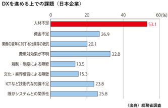 多くの経営者はDXの必要性を理解しているものの、様々な課題が障壁となっています。その中でも「人材不足」が53.1%にも上ります。