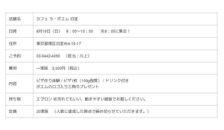 カフェ ラ・ボエム 白金では、5年前から、子供たちの夏休みの思い出づくりになればと地域コミュニケーションの一環として、ピザ作り体験教室を行っております。朝8時〜集合して、親子でワイワイ本格ピザ作りをお楽しみください。今年は、開催5年目の記念に『ボエムのロゴ入り三角巾』をお子様(一家族1名)にプレゼント致します! ※募集人数に達しましたら、募集終了となりますので予めご了承くださいませ。
