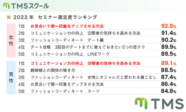 「TMSスクール」とは、婚活総合カンパニーTMSグループが提供する成婚メソッドの1つです。婚活のスキルアップにつなげるセミナーのご提供だけでなく、自分自身の活動の傾向を数値化し、客観的にうまくいっている点・課題を把握できたうえで、課題に特化したセミナーを選択できるため、効率的かつよりよい活動ができるようにサービス提供を開始しました。TMS(全国結婚相談事業者連盟)に加盟する全国の結婚相談所にて利用できます。
