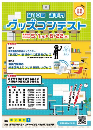 第10回のコンテストでは大阪府内の高校に通う高校生と追手門学院大学の大学生を対象に、明光義塾の公式キャラクター「サボロー」を世の中に広めるグッズと、広報普及活動を含むアイデアを募集いたします。