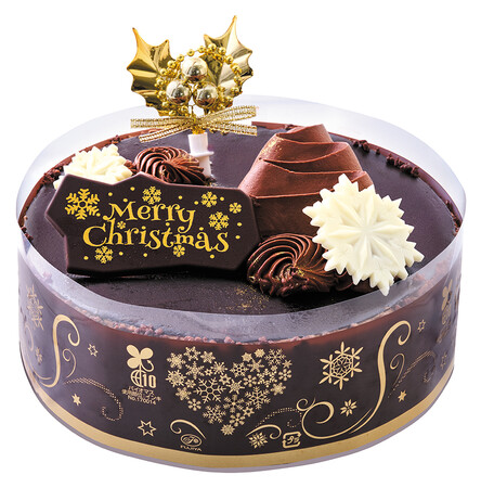 人気のプレミアムチョコ生ケーキをクリスマス仕様にアレンジ。ココアスポンジにフレーバービーンズカカオマス使用のチョコクリームとビターな味わいのチョコガナッシュを重ね、アクセントにキャンディングアーモンドをサンドしました。雪の結晶のチョコアタッチメントや柊を飾り、金粉をあしらって仕上げたワンランク上のチョコレートケーキです。