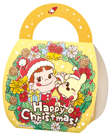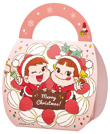 お菓子のお家をイメージしたボックスにお菓子を詰め合わせました。ぐるっと1周、ペコちゃんたちがクリスマスを楽しんでいる可愛いデザインです。存在感のある形状なので、ご自宅に飾って楽しむのもおすすめです。