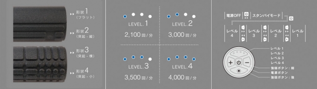 1分・約2,100回〜約4,000回の4つの振動レベルで、コンディションや好みに合わせて使い分けが可能。