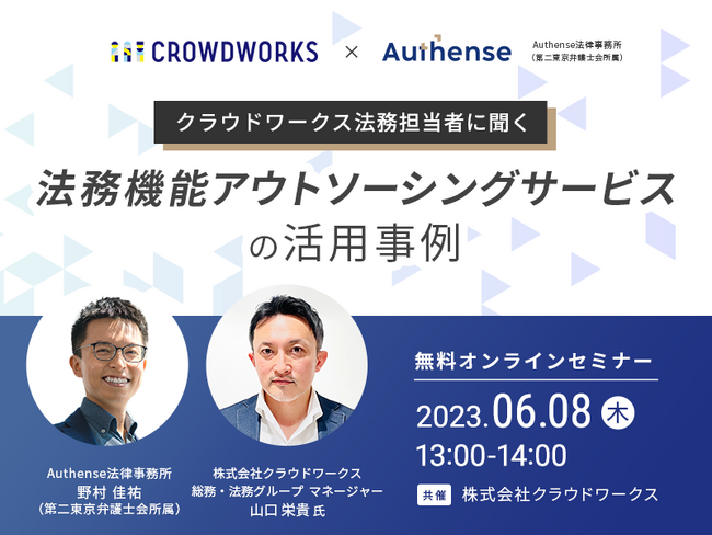 Authense法律事務所(東京都 港区)は、6月8日(木)に「クラウドワークス法務担当者に聞く『法務機能アウトソーシングサービス』の活用事例」と題したウェビナーを開催いたします。今回は、3月に開催したウェビナー「【2023年】法務人材雇用の難易度から考える 企業が知っておくべき『法務機能外注』の選択肢」にて、「実際どのように活用すればよいのかなど、事例を聞きたい」という多数のお声にお応えし、開催するに至りました。実際に当事務所の法務機能アウトソーシングサービスをご利用いただいている株式会社クラウドワークス コーポレート本部 経営管理部 総務・法務グループ マネージャーである山口 栄貴氏をお迎えし、本サービスの活用事例やご利用いただいてよかった点、依頼時のイメージとのギャップなどについてお話しいただきます。