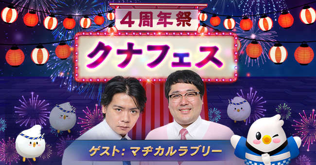 株式会社MOVEFAST Company (東京都港区六本木、代表取締役社長:安 相一)は、ライブ配信アプリHakunaにて、7月28日~30日に4周年を記念したクナフェスを開催することをお知らせします。スペシャルゲストには、現在Hakunaで映像生配信中のオールナイトニッポン0(ZERO)のパーソナリティを務めるマヂカルラブリーが登場!