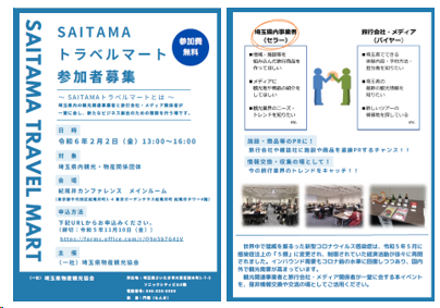 一般社団法人埼玉県物産観光協会(会長:朝霧重治)は、県内の観光施設、飲食、宿泊施設、市町村及び観光協会担当者(セラー)と、旅行会社及び海外・国内メディア(バイヤー)との交流の機会を設け、観光旅行に関する情報交換や事業・ビジネス拡大の場を創出する「SAITAMAトラベルマート」を令和6年2月2日(金)に開催いたします。