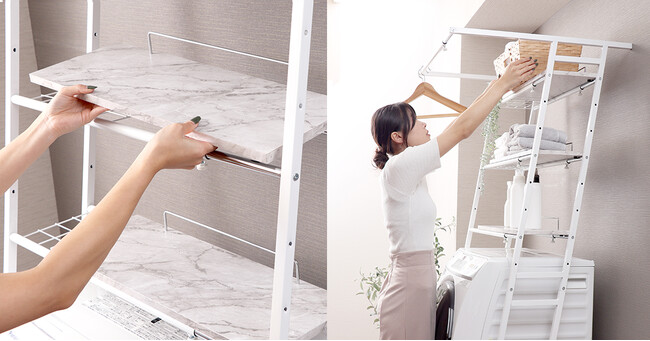 家具の企画、製造、販売を行う株式会社ヤマソロ(本社:兵庫県小野市、代表取締役社長:山本 一郎)は、運営するネット通販『ヤマソロ公式ECショップ』にて、壁に立て掛けるだけで設置ができるランドリーラックをEcho(エコー)シリーズから発売しました。洗濯機上に収納スペースを増やせる「ランドリーラック」は、限られた空間を有効活用できる便利なアイテムですが、設置がネックになることも。引っ越し前ならともかく、洗濯機を置いた後に設置することを考えると、あの重たい洗濯機の移動に頭を悩ませてしまいます。そんなご家庭に向けて企画されたのがこの伸縮立て掛けランドリーラックです。洗濯機の両脇にランドリーラックの細いフレームが入るスペースさえあれば、洗濯機の前からすっと滑り込ませるだけで、簡単に設置ができる優れもの。ラックの横幅は伸縮式なので洗濯機や置く場所に合わせ自由に調整が出来ます。上部のハンガーバーは洗濯物の一時掛けや室内干しに。清潔感あふれる真っ白なフレームに棚板の柄が「大理石柄ホワイト」「木目柄ウッドホワイト」の2タイプ。ヤマソロ公式ECショップで販売をしています。