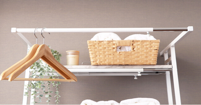 ラック上部のハンガーバーは、洗濯物を干す前の一時掛けスペースとして便利です。室内干しにも。