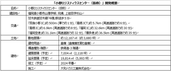 当社初!物流施設の開発事業に参画 2024年春に竣工予定の福岡県小郡市・物流施設に優先出資〜SPC(特別目的会社)を通じて「小郡(おごおり)ロジスティクスセンター(仮称)」の用地取得〜
