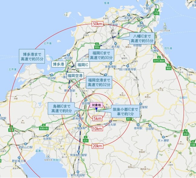 当社にとって初の物流施設開発事業である「小郡ロジスティクスセンター(仮称)」は、大分自動車道筑後小郡インターチェンジに隣接し、大分自動車道、九州自動車道、長崎自動車道が交わる鳥栖ジャンクションまで10km圏内の場所にあり、九州全域への配送を担う物流拠点です。また、甘木鉄道 今隈駅にも隣接しており、通勤にも利便性が高く、本施設誕生にともなう地域雇用の活性化も見込まれます。