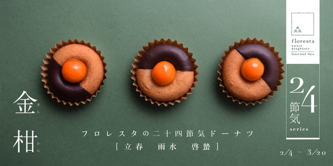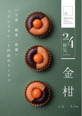 株式会社フロレスタ(本社:大阪市浪速区/代表取締役社長:辻尾吉厚)は、2022年より旬を味わう二十四節気ドーナツをリリースし、第1弾として2月4日(金)の立春から「金柑チョコレート」のドーナツを販売開始いたします。