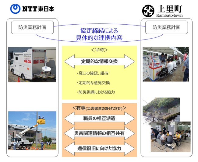 上里町(町長:山下 博一)と東日本電信電話株式会社 埼玉支店(支店長:石川 達、以下「NTT東日本」)は、災害時の相互協力による通信障害の早期復旧に向けた「災害時における通信障害復旧の連携等に関する基本協定」を締結しました。これは、大規模災害に備えた相互協力による通信中断の早期復旧に向けた体制の確立、および昨今の台風等強力な暴風雨によって引き起こされる電柱や樹木の倒壊等障害物発生に伴う通信中断や道路の通行規制の長期化に備え、早期の障害物除去体制を確立し、地域の皆さまへの迅速な通信手段確保および道路開放へ向けた連携強化を目的としています。本協定等の締結に基づき上里町とさまざまな対策を推進し地域の防災力向上に取り組んでいきます。