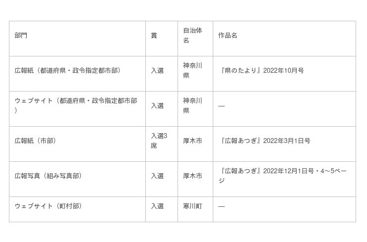 全国の都道府県及び市町村の広報紙、ウェブサイト、広報写真などを対象にした「全国広報コンクール」(公益社団法人日本広報協会主催)において、神奈川県、厚木市及び寒川町の作品が受賞しました。