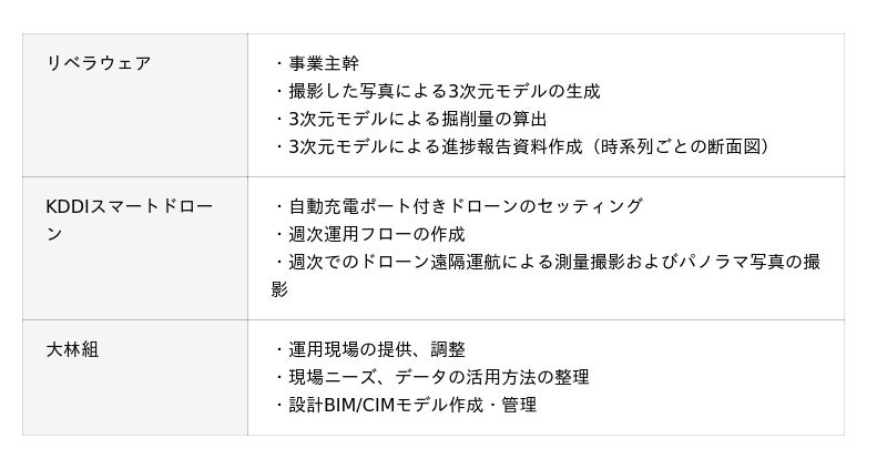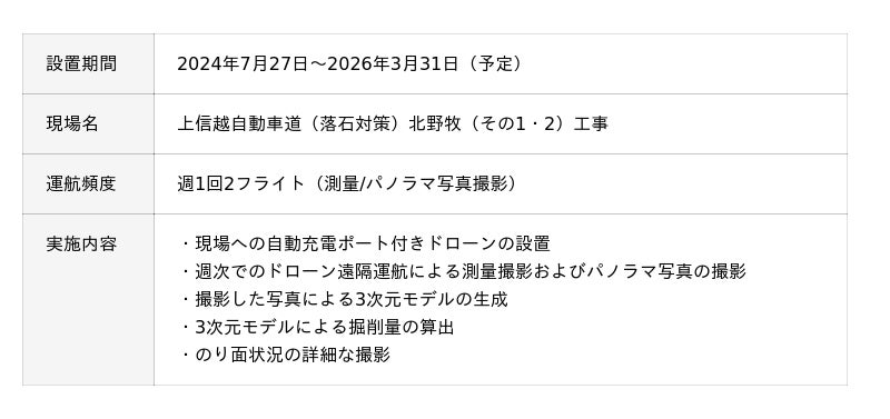 株式会社Liberaware(本社:千葉県千葉市、代表取締役:閔弘圭、以下リベラウェア)とKDDIスマートドローン株式会社(本社:東京都千代田区、代表取締役社長:博野雅文、以下KDDIスマートドローン)と株式会社大林組(本社:東京都港区、代表取締役社長:佐藤俊美、以下、大林組)の3社は、大林組が施工する上信越自動車道(落石対策)北野牧工事(以下「本工事」)において、国内で初めて(※1)建設現場に自動充電ポート付きドローンを1年間常設し、現場補助者なしの目視外飛行(レベル3)(※2)による週次の遠隔自動測量を継続運用しました。この取り組みにより、掘削量(体積)や現場の地形など進捗状況を高精度に可視化することを実現しました。