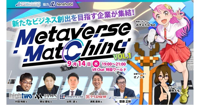 株式会社アイドマ・ホールディングス(本社:東京都豊島区、代表取締役:三浦 陽平)は、株式会社tenshabi(本社:千葉県松戸市、代表取締役:溝口 新平)の協力のもと「Metaverse Matching VOL.1」を2022年9月14日(水)に開催します。