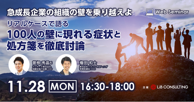 株式会社リブ・コンサルティング(本社:東京都千代田区、代表取締役:関 厳)は、ランサーズCOO曽根氏を招き、リブ・コンサルティングCOO権田とパネルディスカッション形式で急成長企業の組織の壁を乗り越え方を探るオンラインセミナー「リアルケースで語る 100人の壁に現れる症状と処方箋を徹底討論」を2022年11月28日(月)に開催いたします。