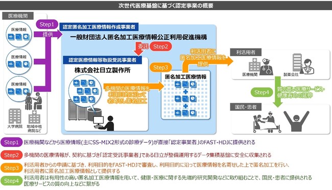 日立は、「認定匿名加工医療情報作成事業者(以下、認定事業者)」となる一般財団法人匿名加工医療情報公正利用促進機構(以下、FAST-HDJ)と連携し、医療機関から医療情報を収集・匿名加工し、研究機関などに提供する「匿名加工医療情報作成事業」を開始します。