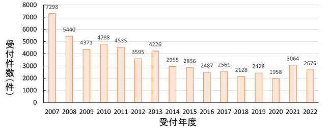 報告書の図2は消費生活用製品安全法が改正された2007年度以降に、NITEが収集した重大製品事故と非重大製品事故の受付件数推移です。2022年度の受付件数を過去と比較したところ、2007年度から63.3%減、前年度から12.7%減でした。