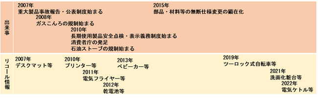 法規制による安全な製品の普及や、業界団体の安全に対する取り組み、消費者への様々な注意喚起によって安全意識が向上したことで、受付件数は全体的に減少しています。しかし、リコール等による大量の事故情報報告により、受付件数は変動をしています。図中の製品名はその年度に発生したリコール製品を表しています。