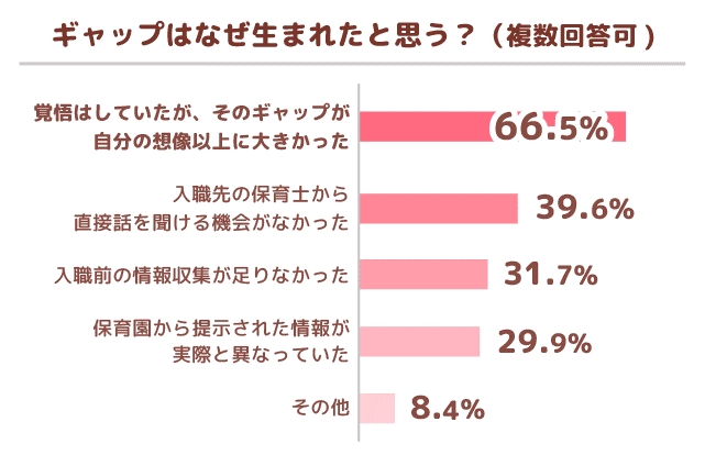 ■「ギャップが生じたのはどうしてだと思いますか?(※複数回答可)」と質問したところ、「覚悟はしていたが、そのギャップが自分の想像以上に大きかった」が66.5%、「入職先の保育士から直接話を聞ける機会がなかった」が39.6%、「入職前の情報収集が足りなかった」が31.7%、「保育園から提示された情報が実際と異なっていた」が29.9%となりました。