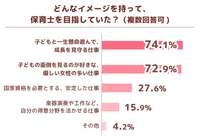■「どのようなイメージを持って保育士を志していましたか?(※複数回答可)」と質問したところ、「子どもと一生懸命遊んで、成長を見守る仕事」が74.1%、「子どもの面倒を見るのが好きな、優しい女性の多い仕事」が72.9%、「国家資格を必要とする、安定した仕事」が27.6%、「楽器演奏や工作など、自分の得意分野を活かせる仕事」が15.9%となりました。
