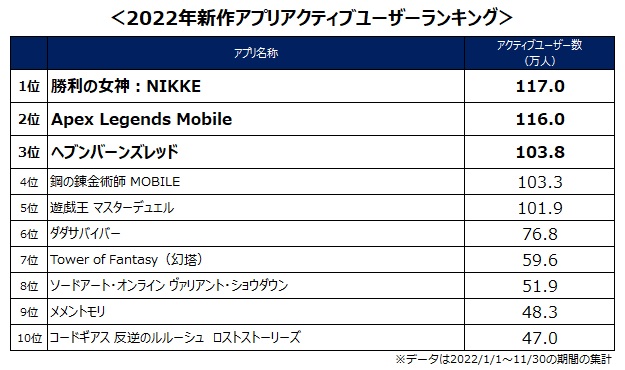 2022年モバイルゲームアクティブユーザー数ランキング_2022年新作アプリ1位は『勝利の女神:NIKKE(ニケ)』