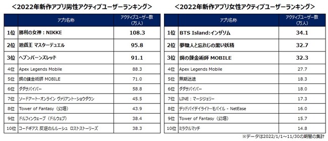 それでは、男女別に2022年最もプレイされた新作アプリのアクティブユーザー数を見ていきます。