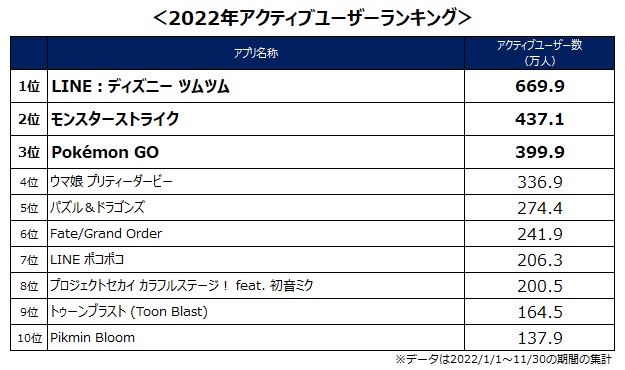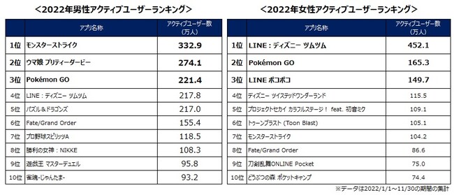 男性で最も多かったのは、全体では2位の『モンスターストライク』が332.9万人。女性では、『LINE:ディズニーツムツム』が最も多く、452.1万人となっています。男女ではプレイされているアプリに大きな違いがみられ、男性側では『勝利の女神:NIKKE』のような美少女系ゲームが、女性側では『ディズニーランド ツイステッドワンダーランド』のような女性向けタイトルが、上位に入っています。そんな中、男女ともに上位に入っているのは、『Pokémon GO』となっており、男女問わず、多くのユーザーにプレイされていることがわかります。