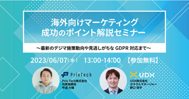 Priv Tech株式会社(本社:東京都港区、代表取締役:中道 大輔、以下Priv Tech)は、UDX株式会社(本社:福岡県福岡市、代表者:森 英朗、以下UDX)と共同で、無料オンラインセミナー『海外向けマーケティング成功のポイント解説セミナー 〜最新のデジマ施策動向や見逃しがちなGDPR対応まで〜』を2023年6月7日(水)13時より開催いたします。