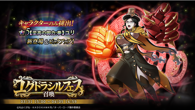 3/31より期間限定の『ユグドラシルフェス召喚』を開催!今回は「★5【至高の御力:拳】ユリ」が新登場&ピックアップ!併せて『ナザリック祭召喚』も同時開催いたします!