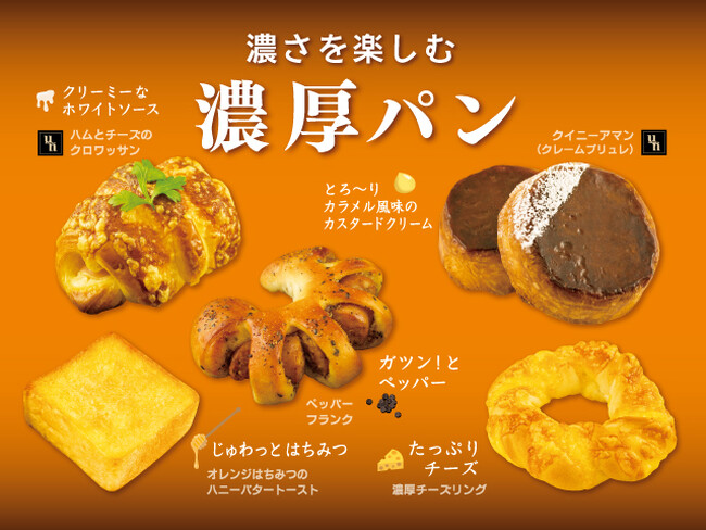 はちみつバターや、ダイスチーズ、ブラックペッパーなどを使用した、あま〜いパンからボリュームたっぷりの総菜パンまで濃厚なパンをご用意いたしました!