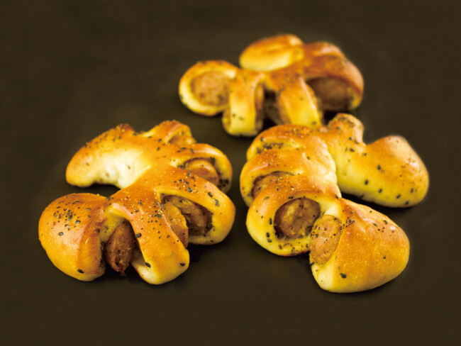 黒ごまを練り込んだ塩パン生地に、ペッパー入りフランクと黒胡椒マヨを包み焼き上げました。