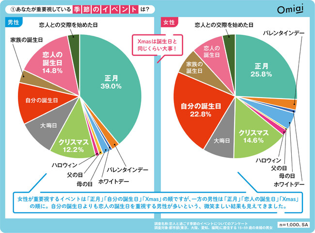 「あなたが重要視している季節のイベントは?(グラフ1.)」のアンケートでは、男女ともに1位はお正月(男性39.0%、女性25.8%)。気になるクリスマスは男女ともに3 位にランクインしました(男性12.2%、女性14.6%)。