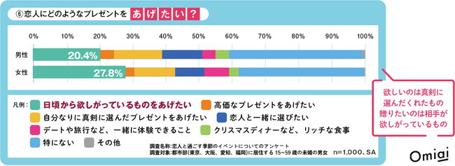 「恋人にどのようなプレゼントをあげたい?(グラフ6.)」のアンケートでは、男女ともに「日頃から欲しがっているものをあげたい」という声が圧倒的で男性が20.4%、女性が27.8%(特にないを除く)。
