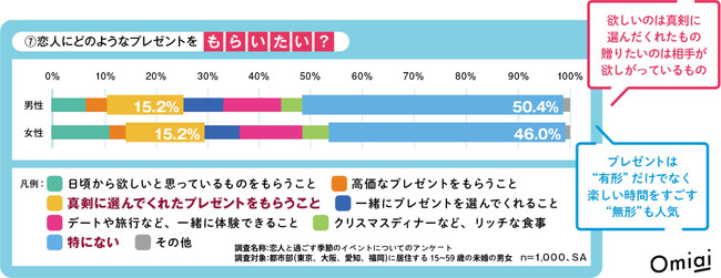 ところが、「恋人にどのようなプレゼントをもらいたい?(グラフ7.)」のアンケートでは、「特にない」が最多(男性50.4%、女性46.0%)で、次いで「真剣に選んでくれたプレゼント」を求める声が多い(男性15.2%、女性15.2%)という結果に。相手が「欲しがっているプレゼント」を贈りたいけれど、もらうプレゼントは「特にリクエストはない」し「真剣に選んでくれたもの」であれば嬉しいという何とも謙虚な意識が見えてきました。また、具体的なプレゼントを贈る“有形派”だけでなく、恋人と一緒の時間を過ごしたいという“無形派”が一定数(「デートや旅行など一 緒に体験できること」男性11.2%、女性12.0%、「クリスマスディナーなどリッチな食事」男性4.0%、女性5.0%)見られたのも興味深いデータです。