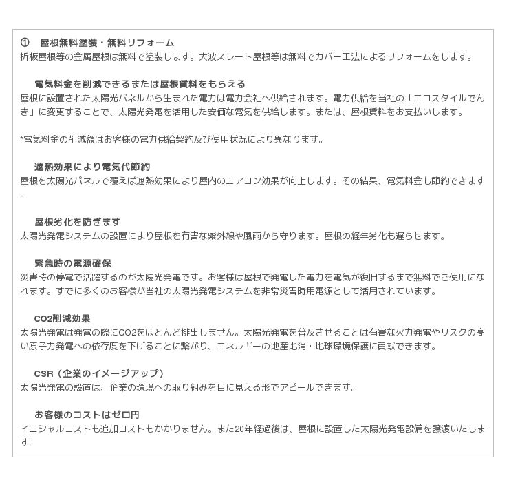 施設の屋根が収益源になることを多くの施設オーナー様にご理解いただき、劣化した屋根の無料塗装・無料リフォームや電気料金の削減など、多数のメリットをお客様負担0円でご提供することで「屋根貸し太陽光発電」を推進し、更なる太陽光発電の普及促進に取り組んでまいります。