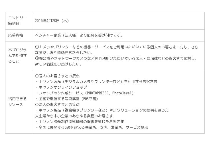 応募者および応募予定者向け説明会を2016年4月13日(水)にキヤノンMJ品川本社で開催する予定です。1次選考を通過した案件は、プロトタイプの製作や関連システムの開発、テストマーケティングの実施などのフェーズに進みます。最終選考を通過した案件については、キヤノンMJグループのリソースを活用した販売連携や新たなビジネススキームの創造などのビジネスアライアンスを進めていきます。