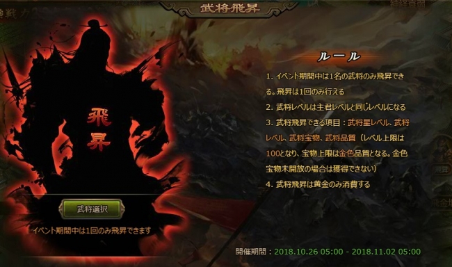武将を飛昇させることができます。飛昇を終えた武将のレベルは100になり(レベルが100以上の場合は変化なし)、星レベルが最大値に、さらに品質も最高値まで上昇します。