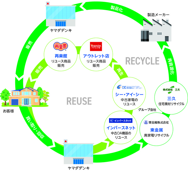 ヤマダホールディングスは、現在アウトレットリユース店の全国展開を加速しています。”家電も資源”そして環境面や資源保護に対する売る責任を果たすため、小売業界初となるお客様から買取・回収した使用済み家電のリユース・リサイクル、再製品化・再販を行い、製品ライフサイクルをヤマダホールディングスグループ内で完結することで、社会全体の環境負荷低減に貢献しています。