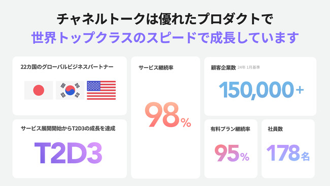 私たちは2018年にチャネルトークを正式ローンチして以来、VIP顧客がビジネスを持続的に成長させるための鍵と捉え、All-in-one AIビジネスメッセンジャーを提供しています。VIP顧客の育成、また顧客体験の向上に寄与するCRM機能を備えたツールとして、常にプロダクトの改善を重ねてまいりました。現在は、AIや電話の領域に機能拡張し、スタートアップやSMBだけでなく、エンタープライズの企業様にもご利用いただけるサービスへ成長しました。実際、日本・韓国・アメリカをはじめとする世界22カ国でサービス提供を行っています。この度、年間経常収益(ARR)約40億円(※1)、導入企業15万社突破のご報告ができ、とても嬉しく思っております。今年は独自の強力なAI技術を通して顧客対応にかかるリソースを削減させるツールへと革新させ、SaaSの本場と言われるアメリカにも本格的に進出し、グローバル市場への進出を加速してまいります。