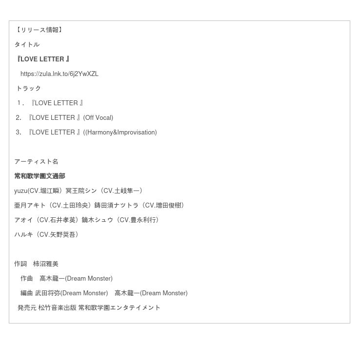 フロムアイドル運営事務局(松竹株式会社)は、音楽と手紙で紡ぐアイドルプロジェクト『Prince Letter(s)! フロムアイドル』( https://twitter.com/prince_letters )より、恋文の日でもある5月23日に、コンテンツ初となる7名によるアイドル楽曲『LOVE LETTER?』(https://zula.lnk.to/6j2YwXZL )の配信、同日18時から松竹ストア(https://store.shochiku.co.jp/shop/c/cPrince/ )において、特別仕様の『文通キット』を販売することを発表いたしました。