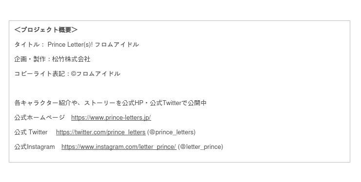 松竹株式会社が展開する文通もできる二次元アイドルプロジェクト『Prince Letter(s)! フロムアイドル』(通称プリエル)。