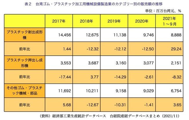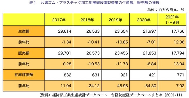 各自動車メーカーがEVの航続距離を向上させるために車体の軽量化を進めており、部品メーカーが金属部品の代わりにプラスチック部品を使用することが多くなったことから、ゴム・プラスチック加工機械設備の需要は拡大した。加えて、比較水準の昨年数値が低いことから、21年1〜9月の台湾当産業の販売額は前年同期比13.04%増の177億9,400万台湾元で、景気は成長に転じた。