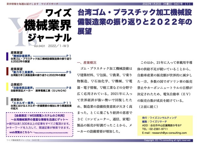 台湾ゴム・プラスチック加工機械設備製造業の振り返りと2022年の展望<ワイズ機械業界ジャーナル2022年1月第3週号発行>