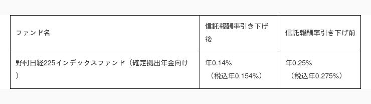 野村日経225インデックスファンド(確定拠出年金向け)の信託報酬率を引き下げ