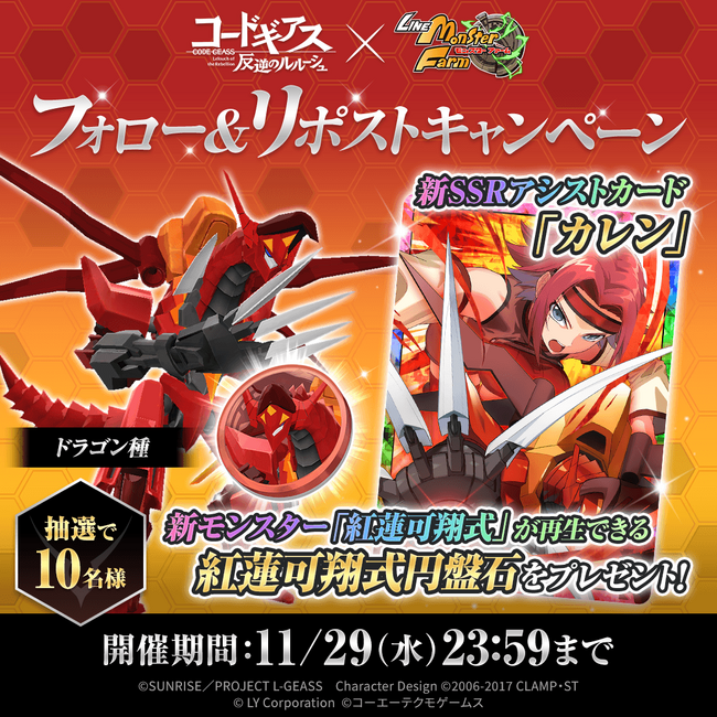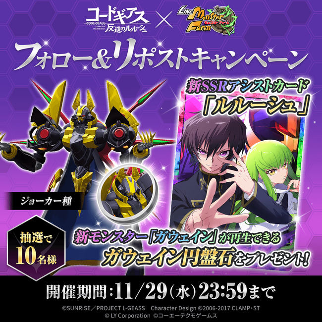 「LINE:モンスターファーム」の公式X(旧Twitter)からポストされる対象ポストをリポストしていただいた方の中から抽選で『コードギアス 反逆のルルーシュ』をモチーフにしたコラボモンスター「ガウェイン」「紅蓮可翔式」が再生できる「円盤石」と新SSRアシストカード「ルルーシュ」「カレン」をセットにして合計20名様に当たるプレゼントキャンペーンを開催します。