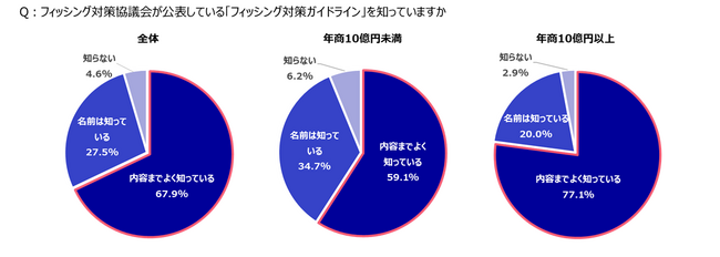 2. 「フィッシング対策ガイドライン」※3について、67%が内容までよく知っている。企業規模別にみると、年商10億円未満では59.1%にとどまり、10億円以上では77.1%が良く知っていると回答。企業規模によって意識の違いがみられる。