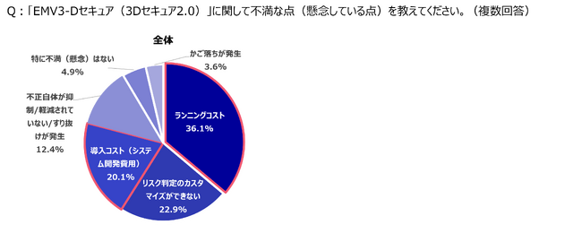 不正注文対策において本人認証の主流になっているのは3Dセキュアでしたが、その最新版であるEMV3-Dセキュアを導入している割合は36.1%にとどまっています。導入が進まない課題として最も多くあがったのはコストの問題で、次に商品単価や商材などを加味した判定ロジックのカスタマイズができない点、不正者のすり抜けなどが危惧されています。