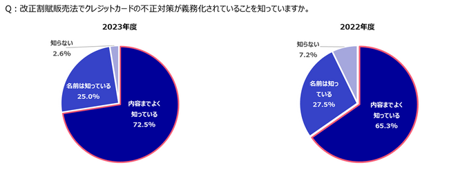 1. 割賦販売法でふれられているクレジットカードの不正利用防止措置義務化について、7割以上が内容までよく知っている。前年より7%増加しており、セキュリティ意識が高まっていると言える。