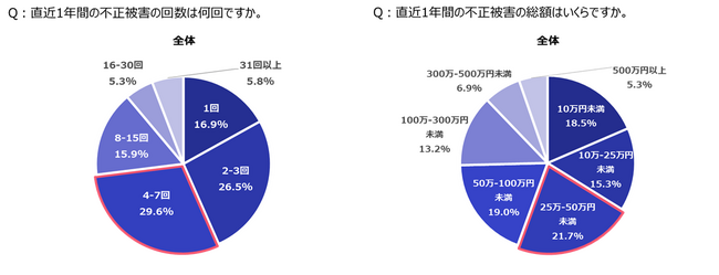 5. 直近1年間で不正注文被害にあった回数は全体では4〜7回が最も多く29.6%で、被害金額としては、年間総額で25~50万円が最も多かった。